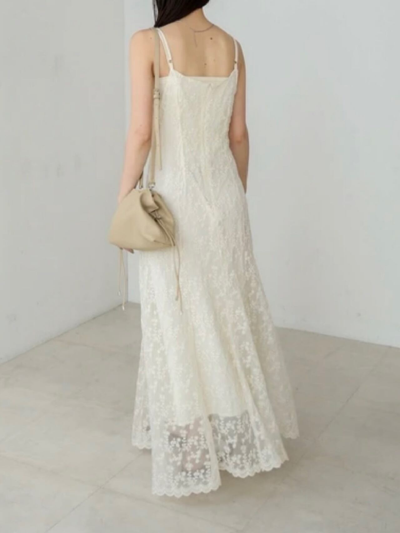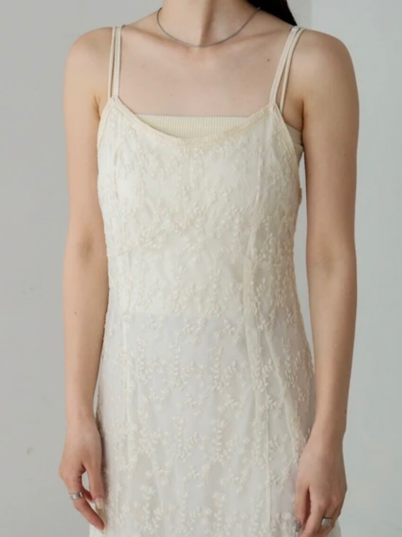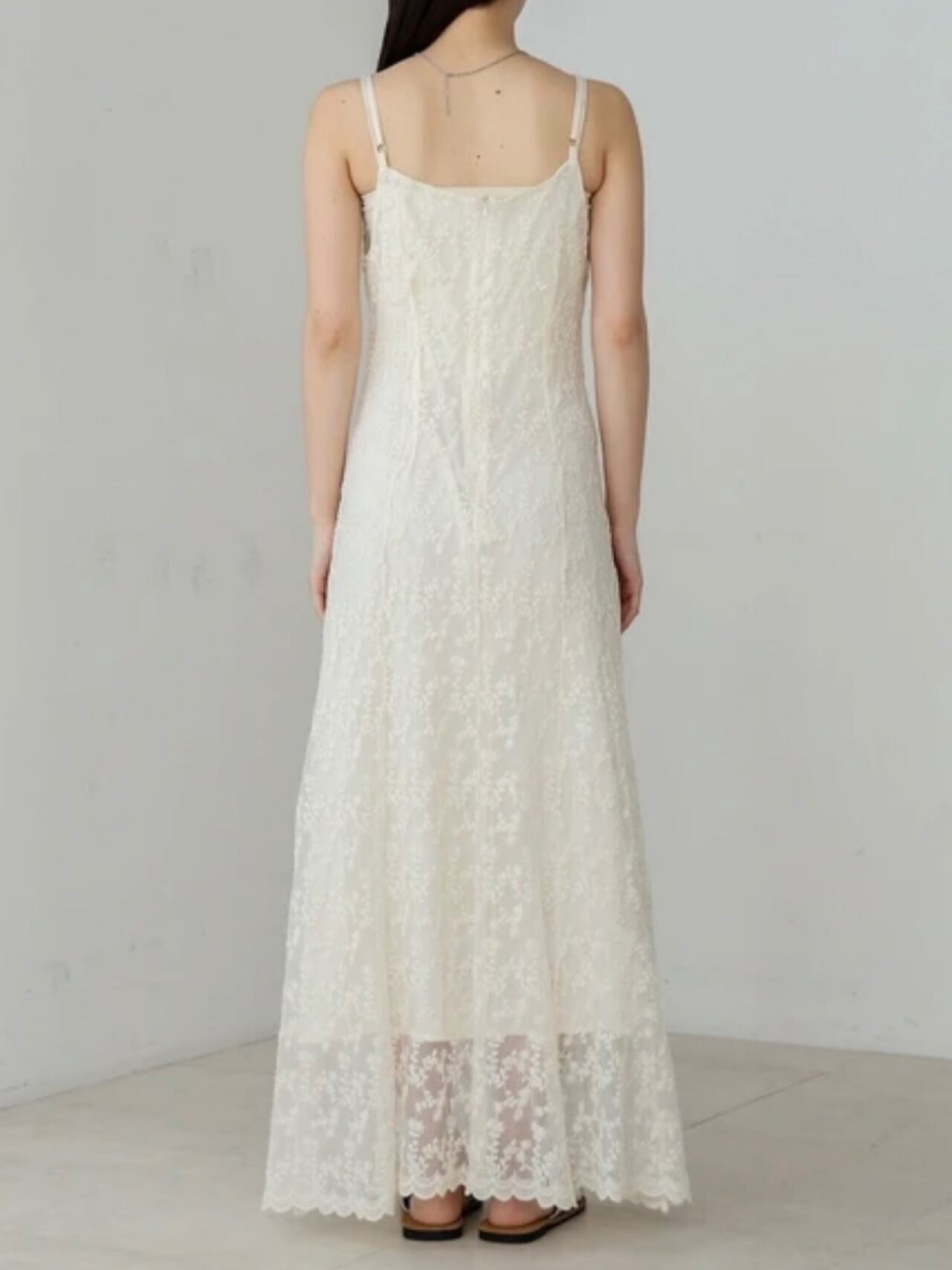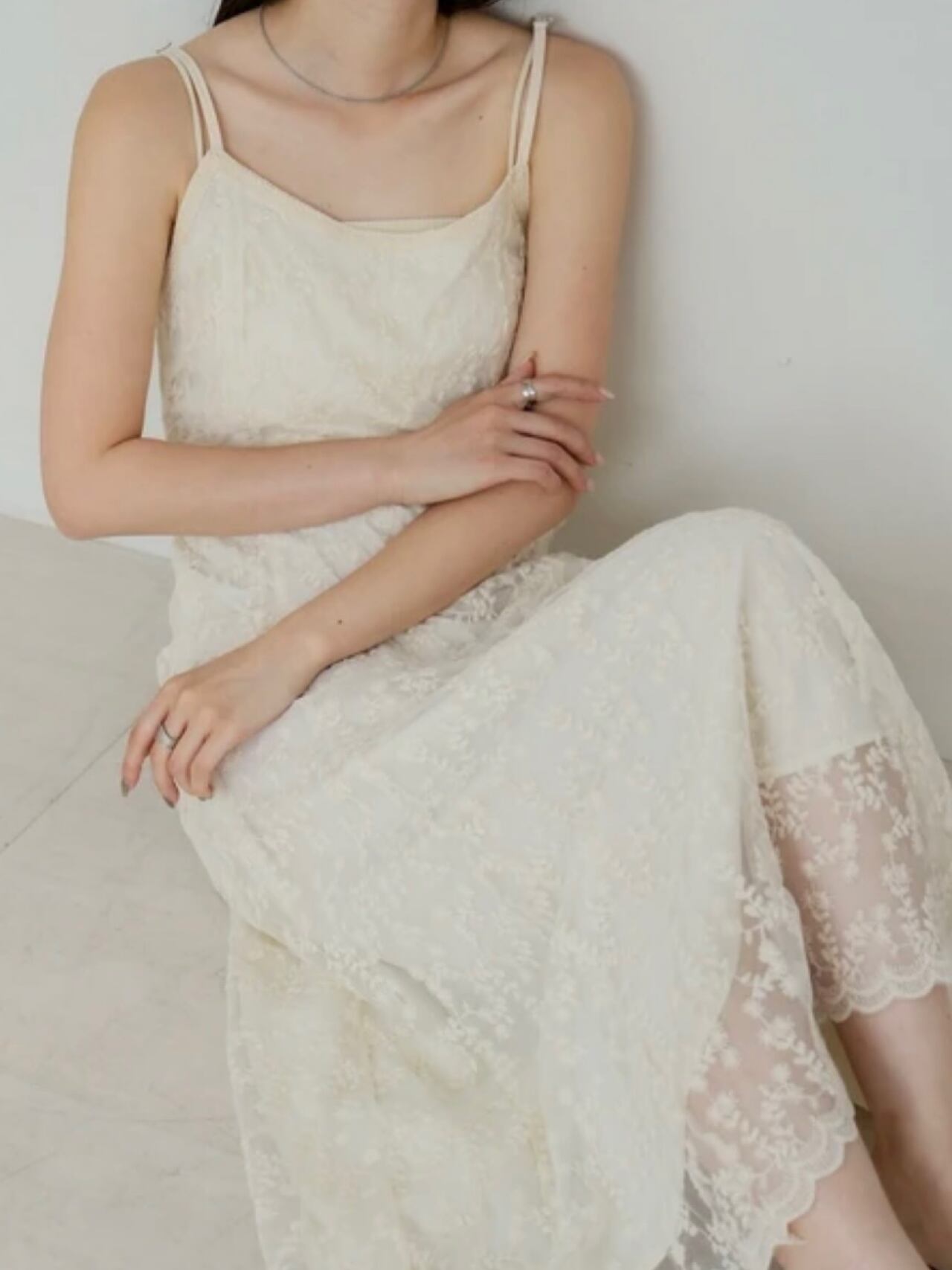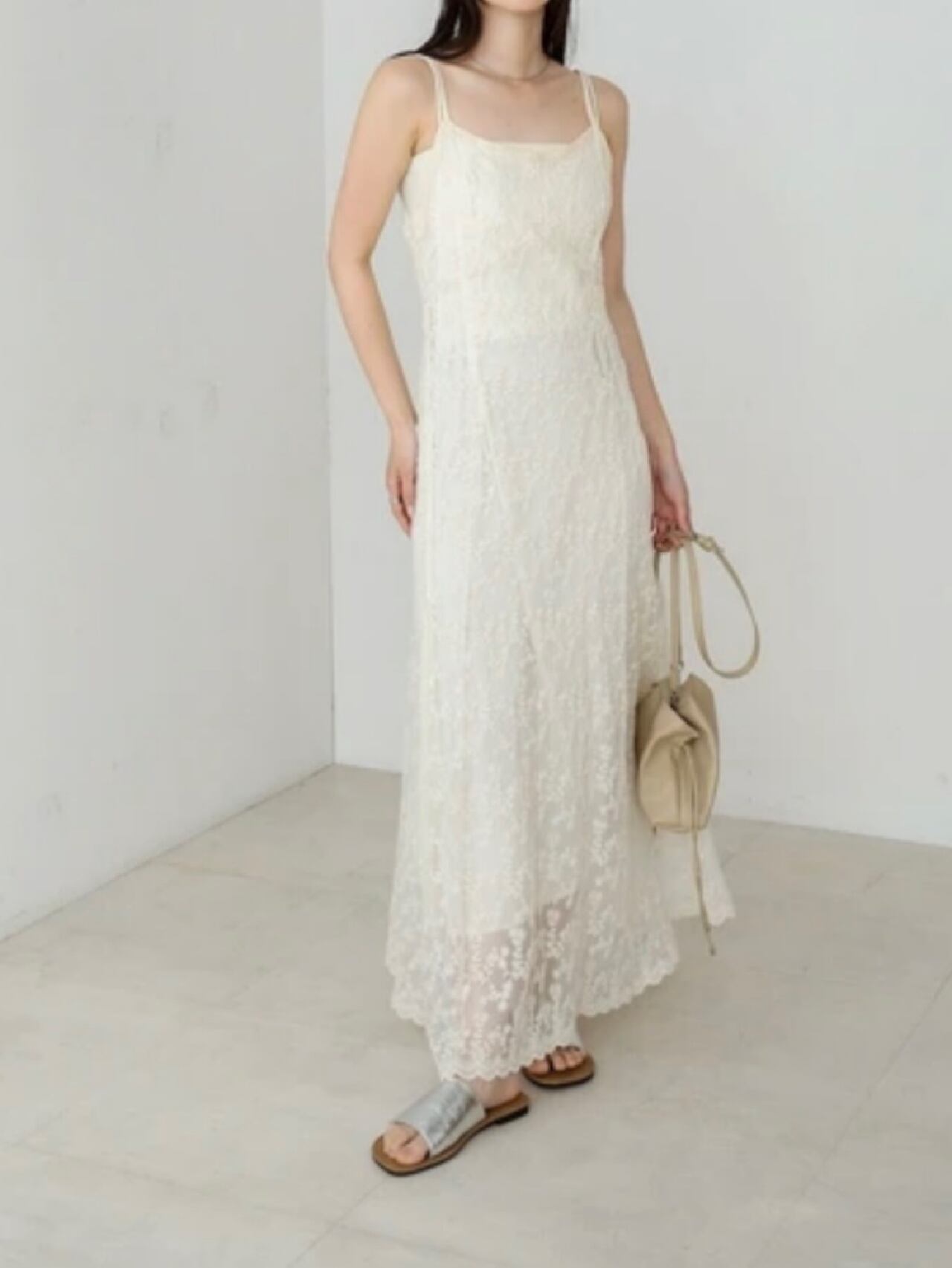 繊細なレースが華やかな印象を与える、大人フェミニンなキャミワンピース。