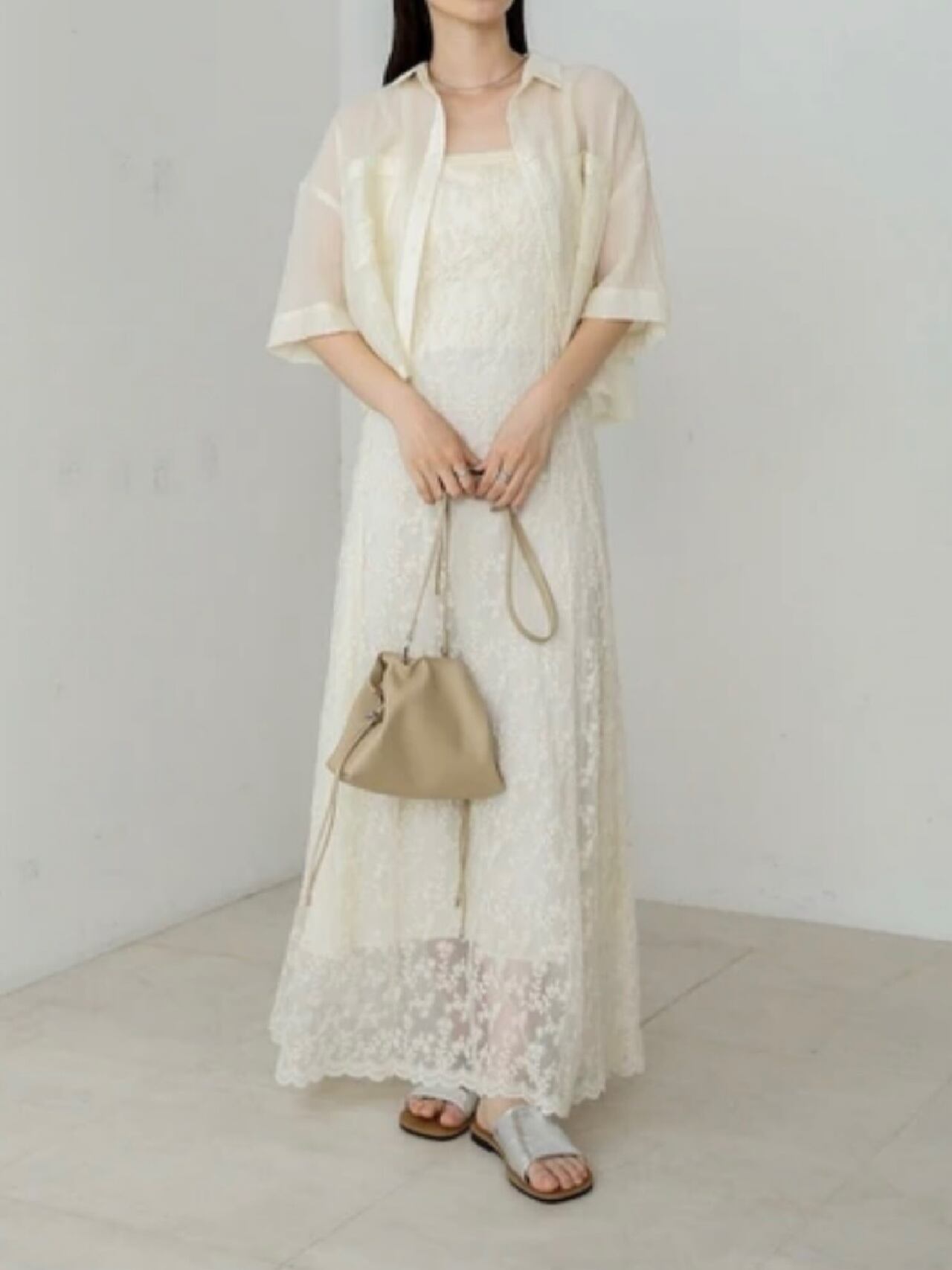 1枚で華やかさが出るので、小物はシンプルなものが◎シアー素材の羽織を合わせて異素材の組み合わせを楽しむこともできます。