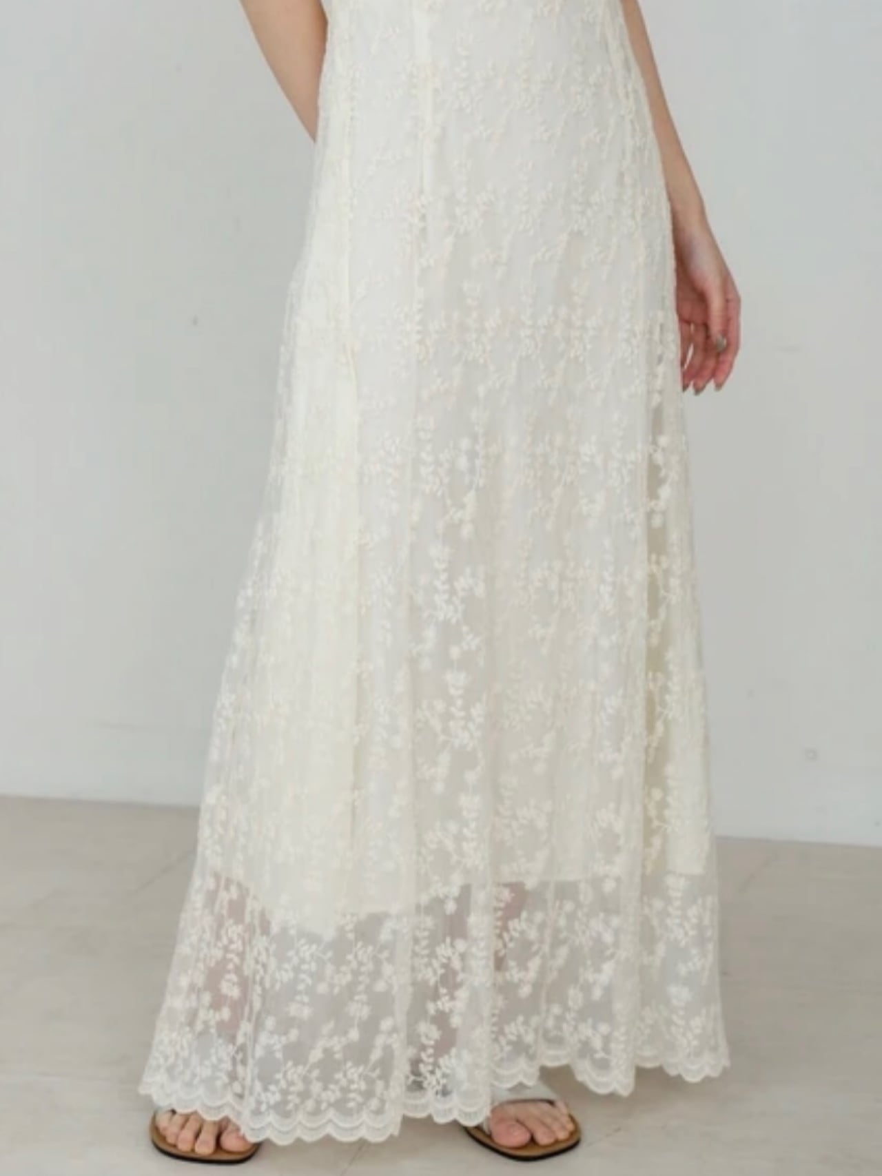 裾にはスカラップ仕立ての繊細なレースデザインを施し、歩くたびにふんわりと揺れるフェミニンな雰囲気を演出してくれます。