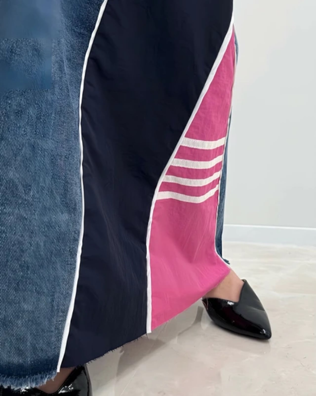 カジュアルの定番デニムとスポーティテイストを異素材で組み合わせた遊び心のあるドッキングデザイン。