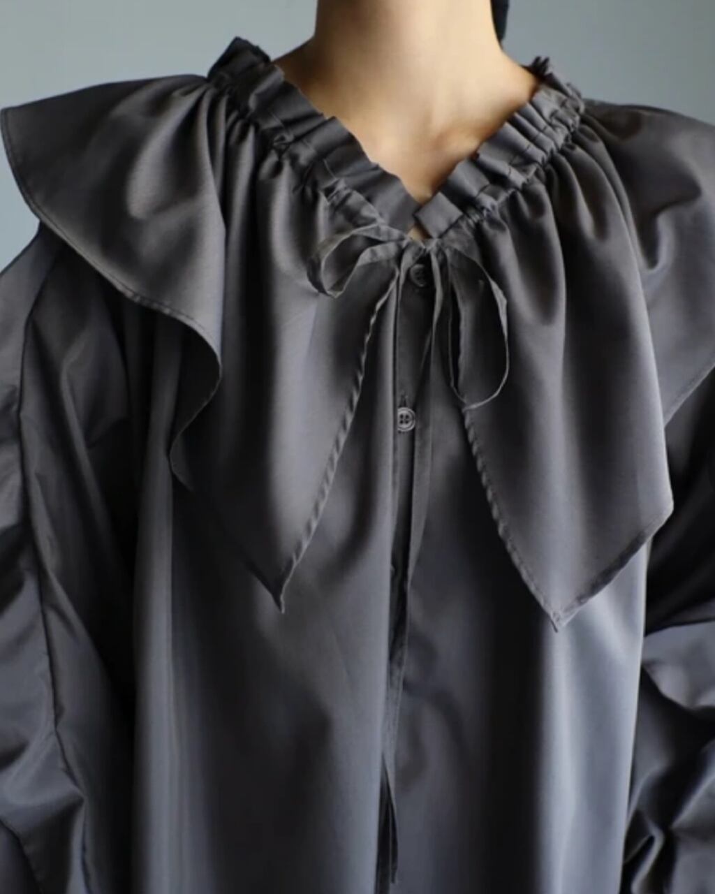 広幅のラッフル衿はフロントのリボンでギャザー量を調整し、お好みのボリューム感を楽しめます。