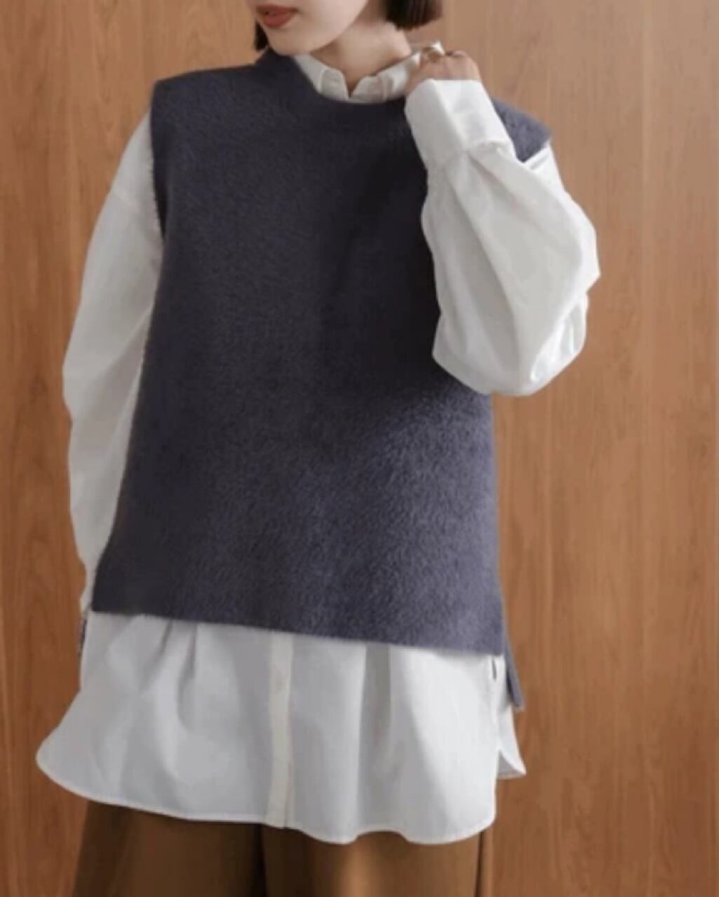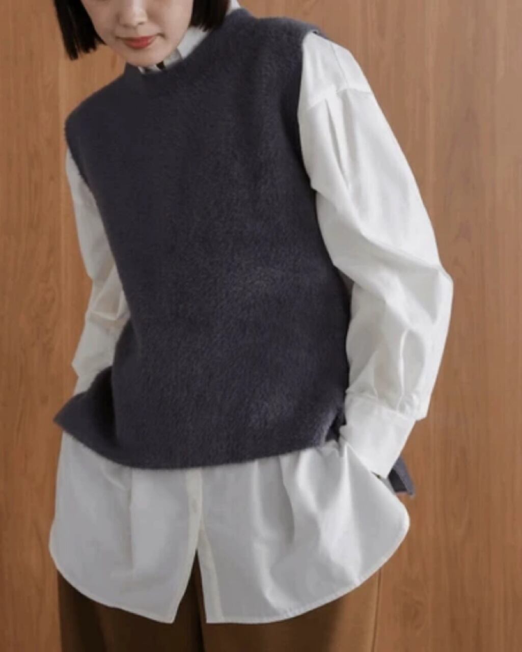 シャツやブラウスとのレイヤードスタイルはもちろん、Tシャツやワンピースに重ねて一枚着としても活躍。