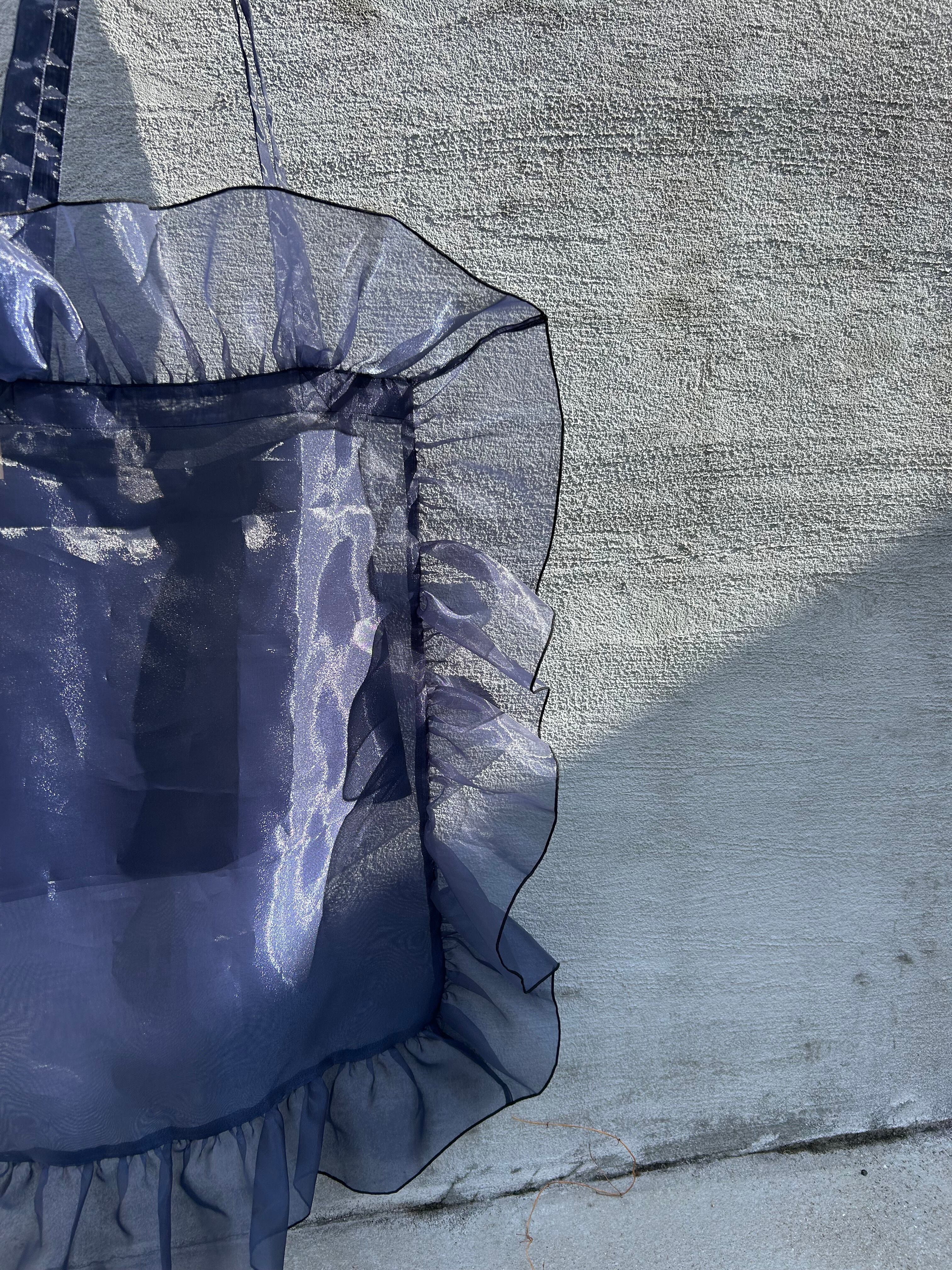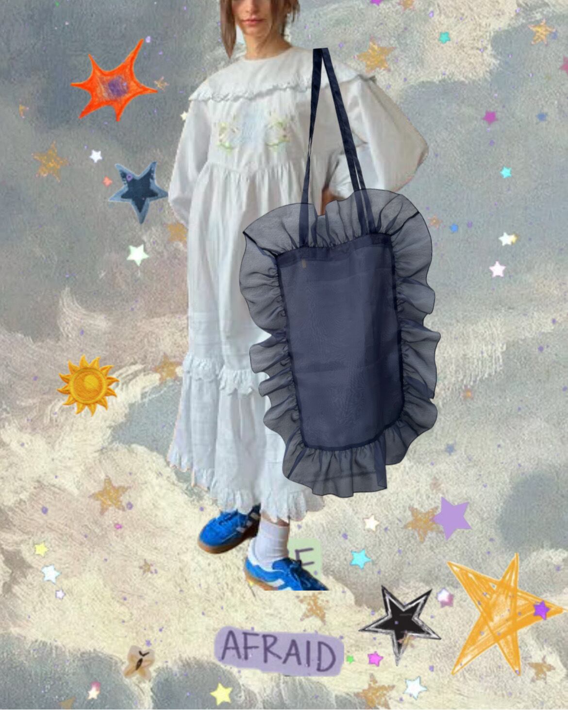 透け感のあるデカBagは、フリルが可愛さを演出する一品。肩掛けにもショルダーにも使える2WAYデザインで、便利さとスタイルを両立しました。内ポケットには貴重品や細々したものを収納できます。内ポケットに入れると透けは殆どありません。