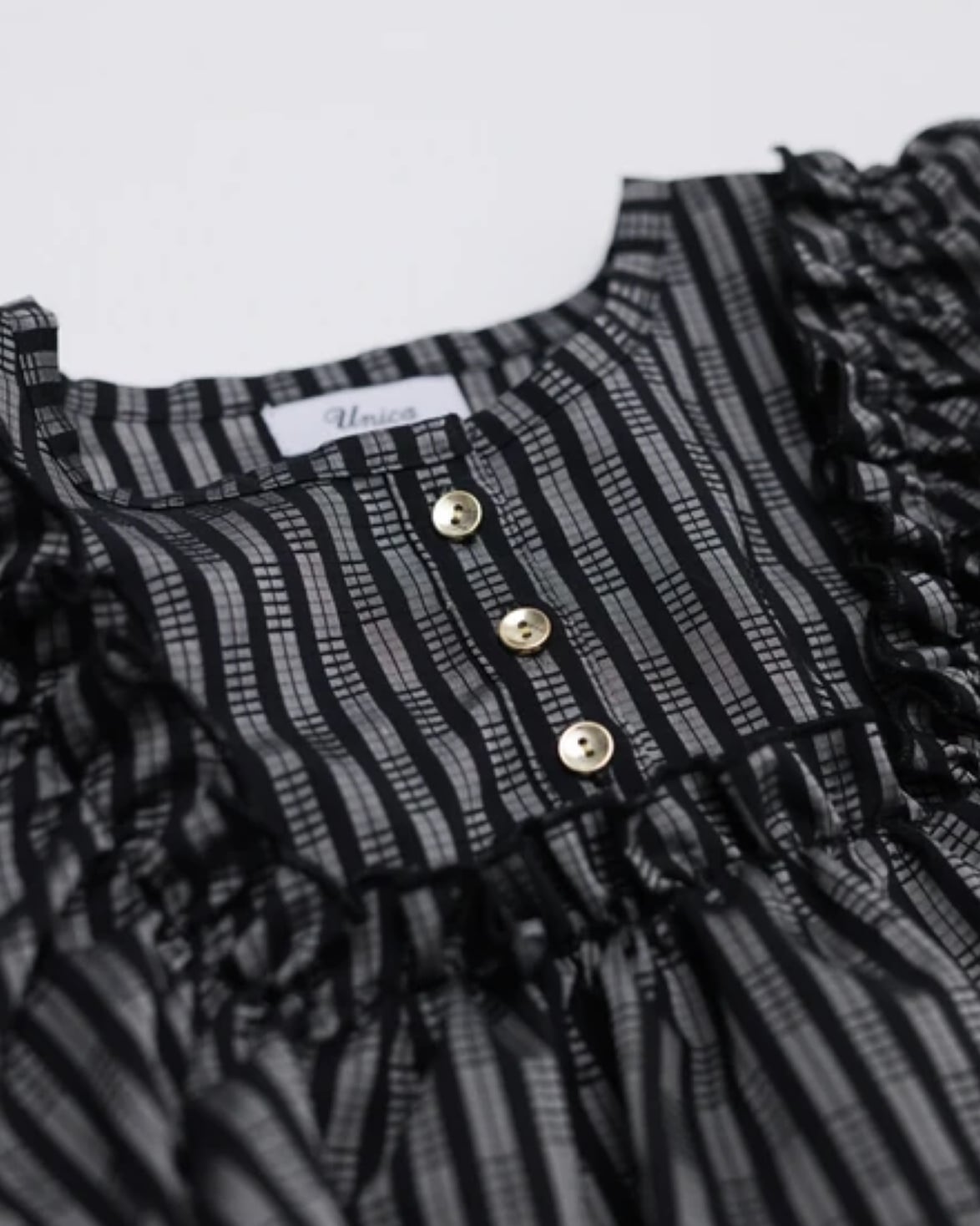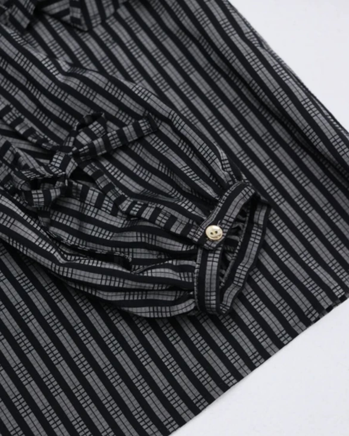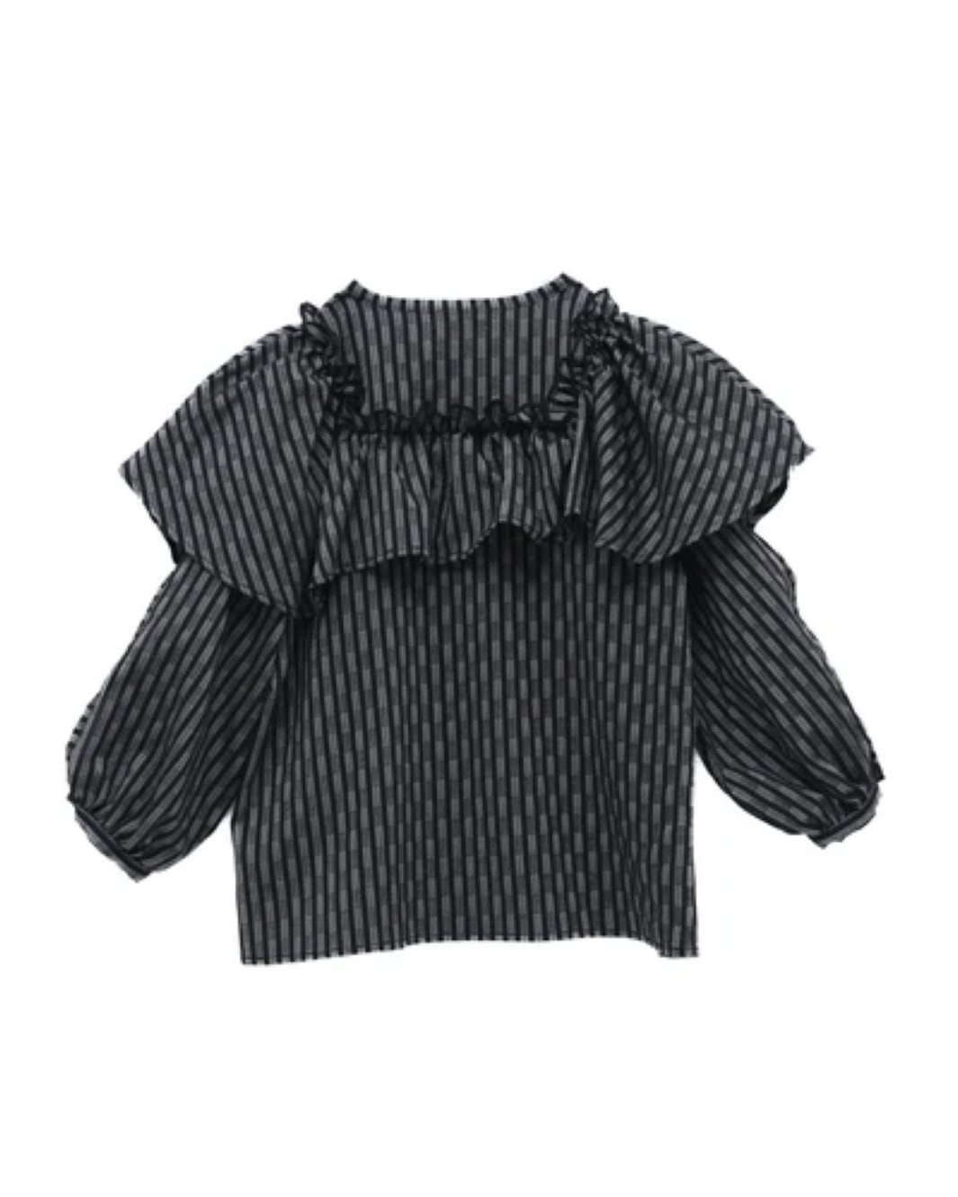大ぶりのフリルがレディな印象のブラウスは、ストライプ柄にすることで品の良さを引き立たせました。下に重ねたアイテムの色をチラ見せして遊ぶことも出来るよう、袖はカットアウト仕様に。サラリとした生地感のため、秋冬を終えた春先にもお使いいただけます。