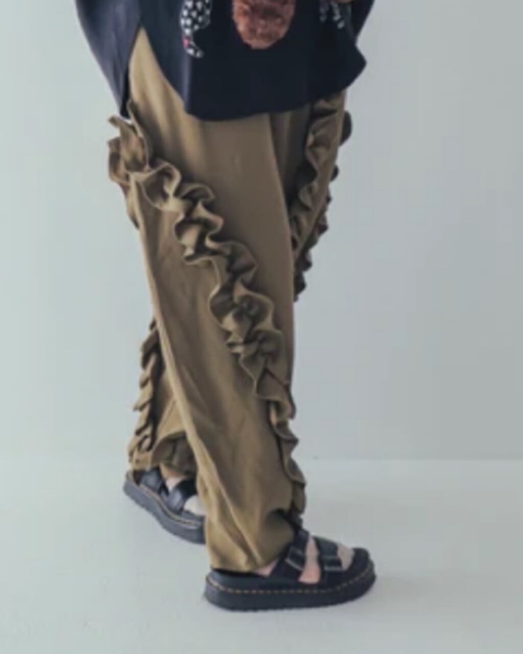 フリルをアシンメトリーに配したパンツ。