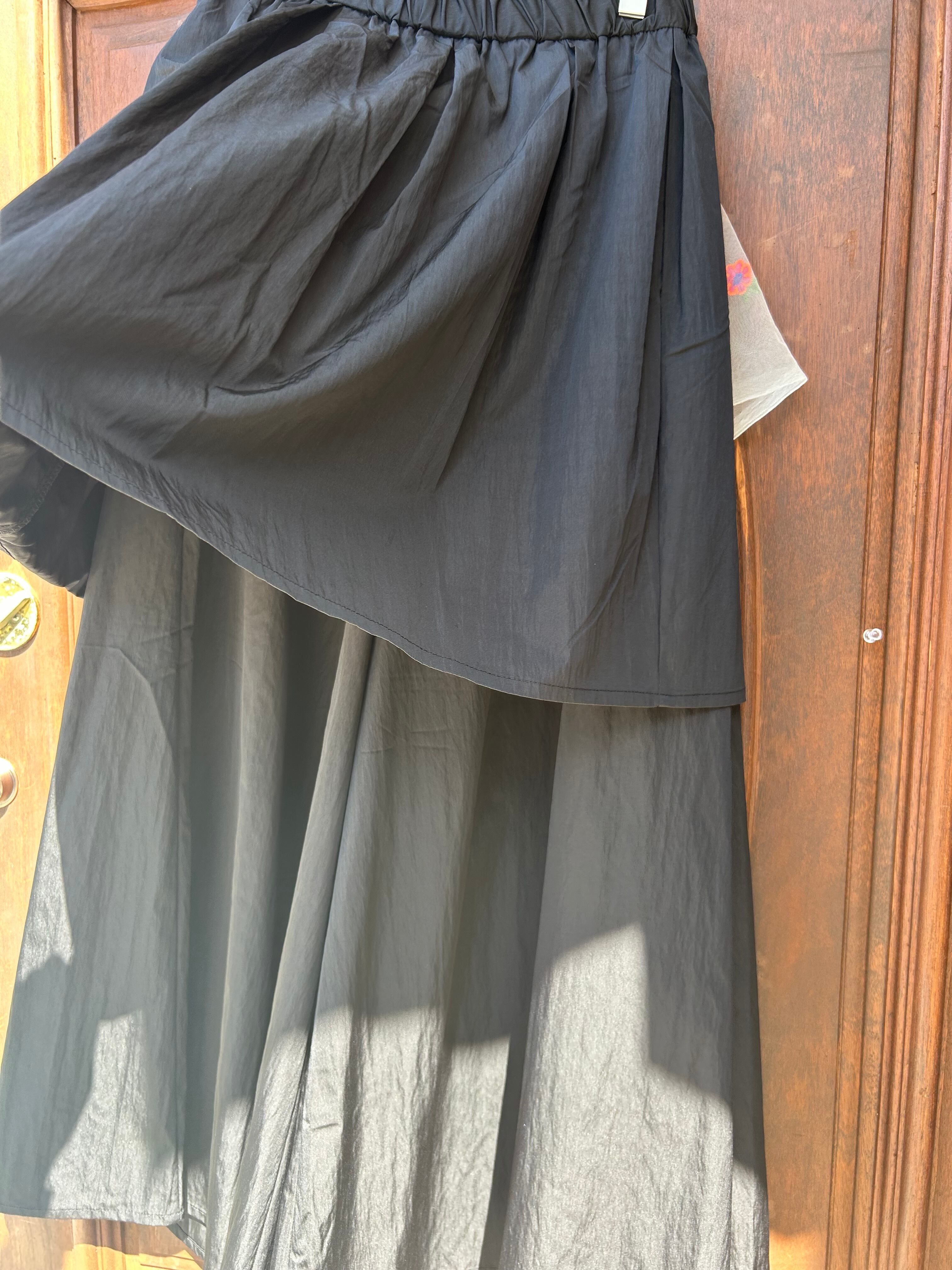 ボトム丈:96cm、ウエスト:68cm(ゴム:96cm)、ヒップ:112cm、前ワタリ:40cm、後ワタリ:45cm、前股上:33cm、後股上:35cm、裾周り:120cm(スカート)ボトム丈:48cm、裾周り:160cm