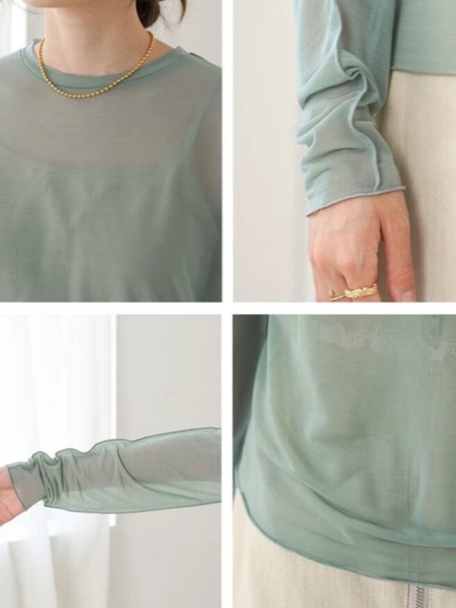 程よく透けるシアー素材を使用しています。やや伸縮で性もあり着心地良く着用いただきます。ご自宅でホームケアしていただけます。