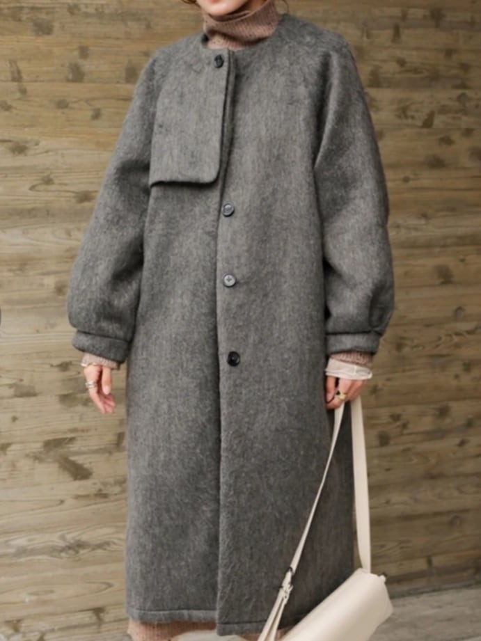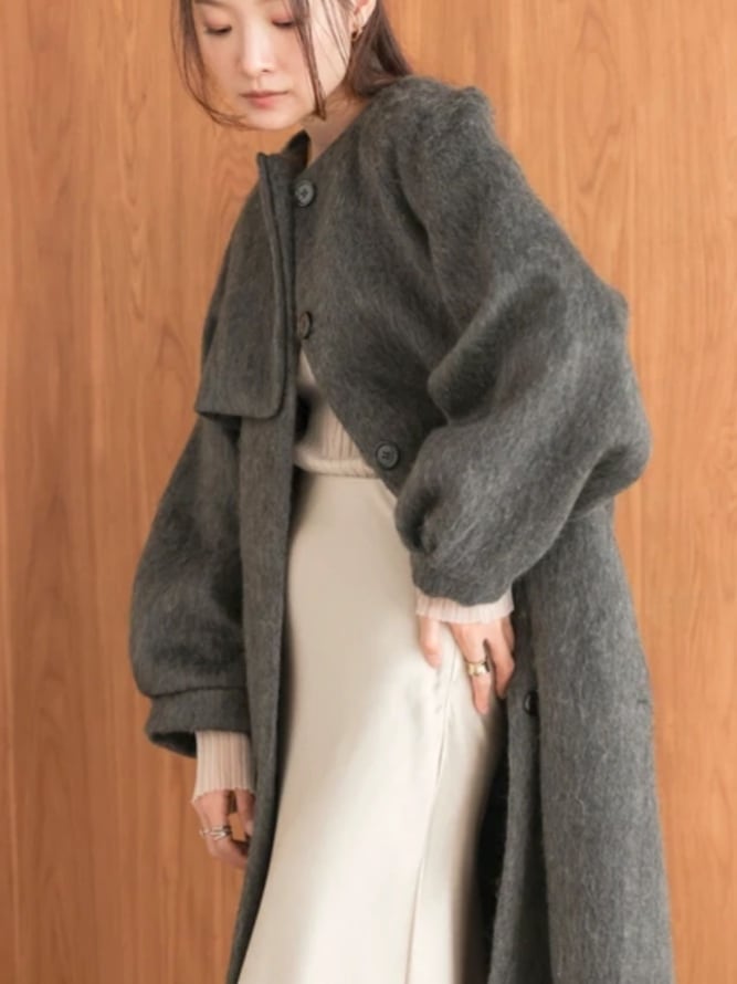 オーバーなサイジングが今っぽいロングコートが登場!シャギーの滑らかな質感で羽織るだけで存在感があり、高級感のある総裏地仕様が嬉しい1枚です。ノーカラーでストールも巻きやすく、右肩のふらしデザインも目を惹くポイントに。ひざ下まで覆う着丈はハンサム見えも叶えてくれます。袖はラグランなので厚地のトップスをインしても楽ちんな着心地です。裾にはベンツを配置し歩きやすさにも配慮しました。
