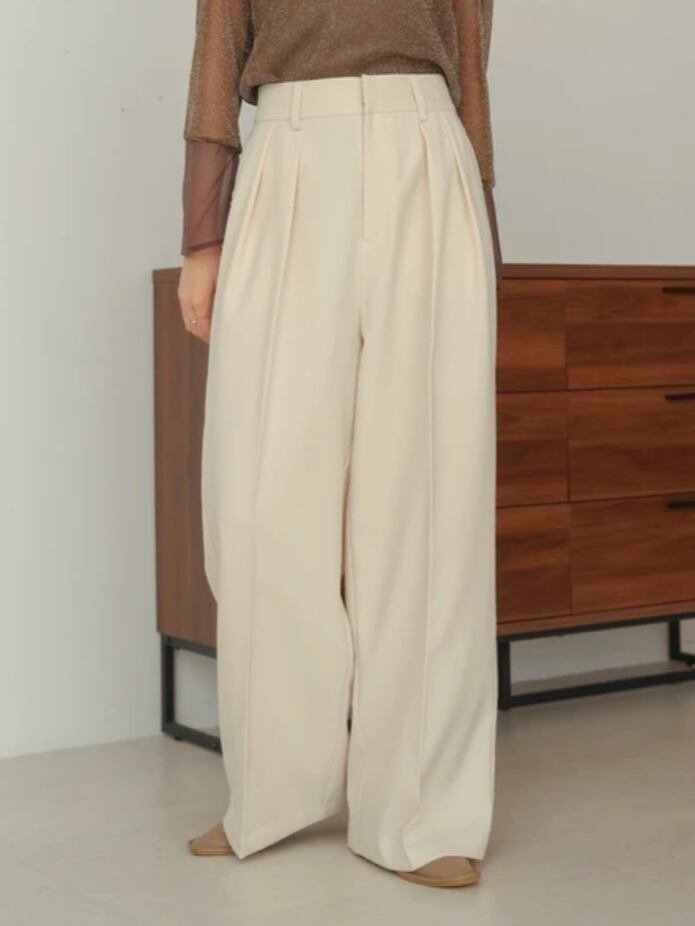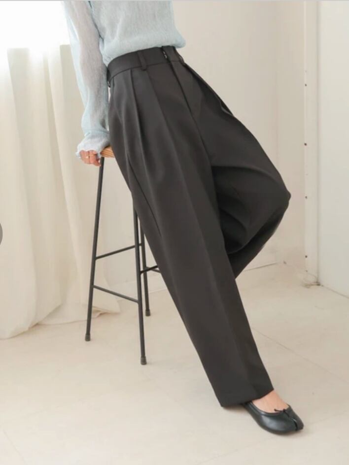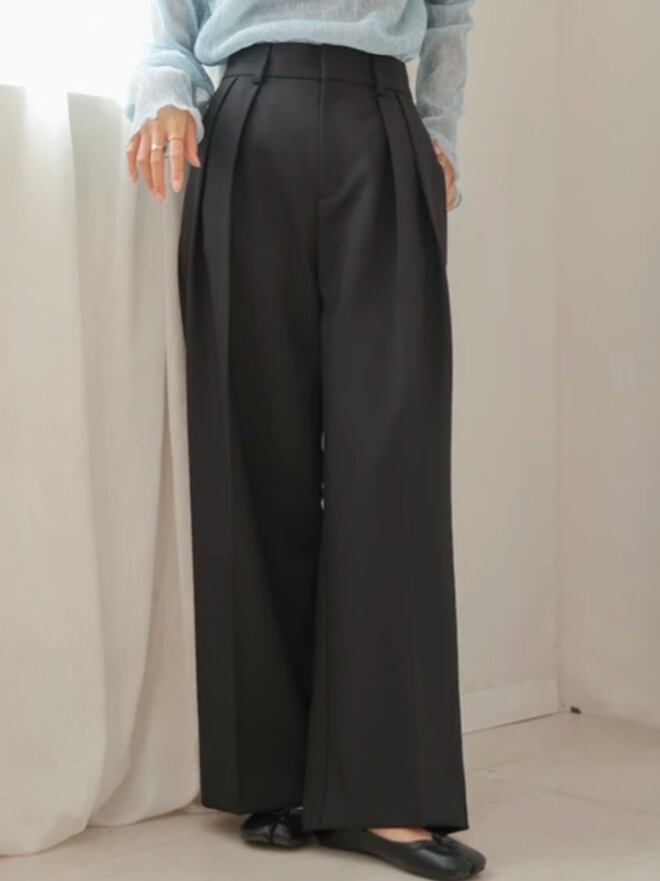 ハンサムなツータックで脚長効果を発揮するキレイめスラックスが登場!ウエストの華奢見えも期待できる適度なハイウエストで、さらにすっきりしたシルエットが叶います。ワイドシルエットながら きちんと感を演出するセンタープレスを入れることで、キレイめなパンツスタイルを確立できる1本になりました。