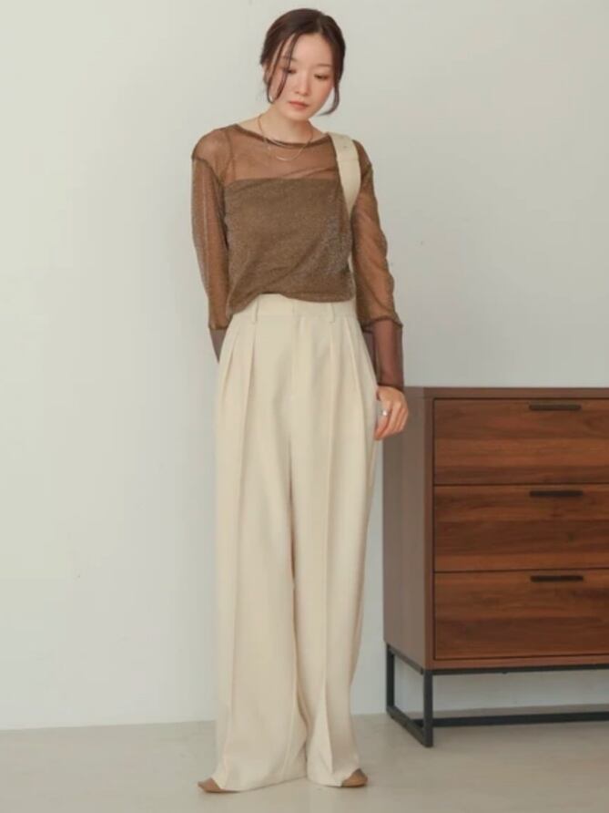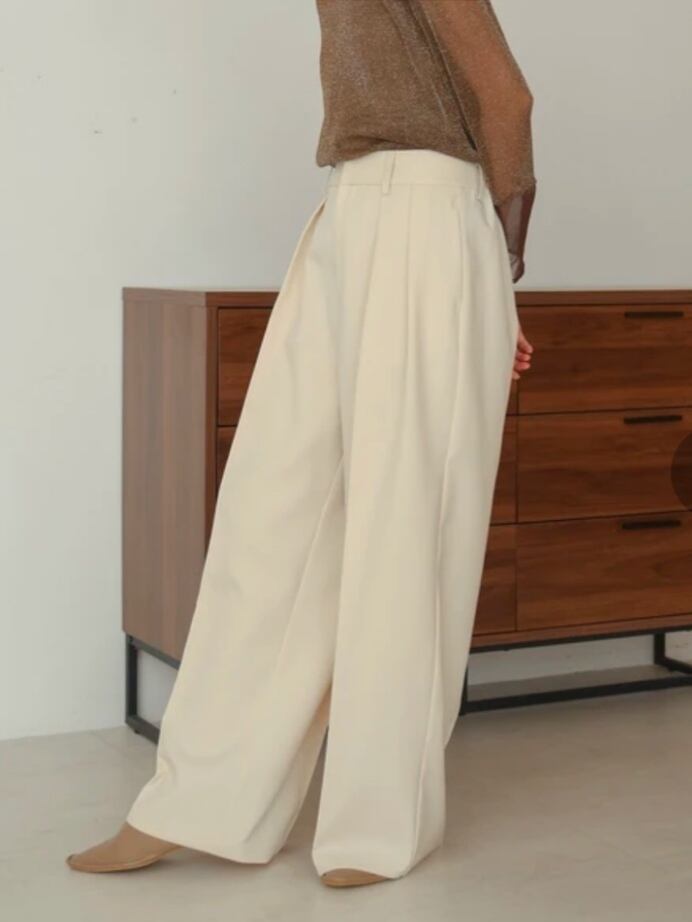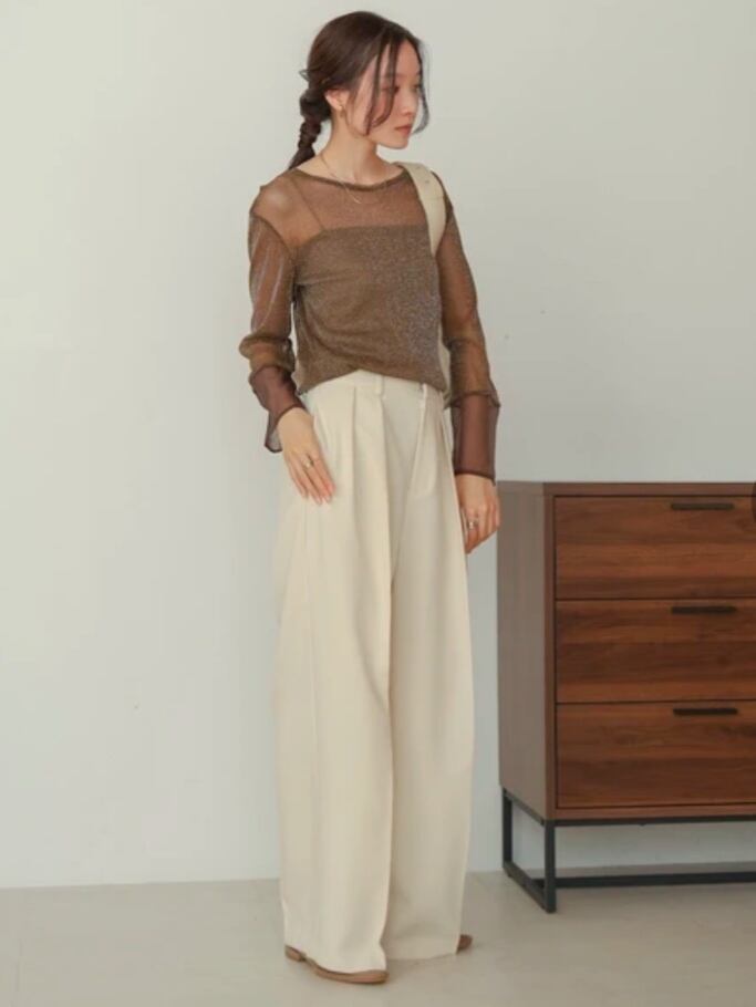 ツータックの絶妙なシルエットを活かすため、トップスはタックインのスタイルがオススメ!まだ暑さの残る初秋には、シアーアイテムなどのライトなカットソーを合わせると着こなしに抜け感が出ます。すとんと落ち感のある今っぽいワイドストレートがデイリーでもオフィスでも活躍します。
