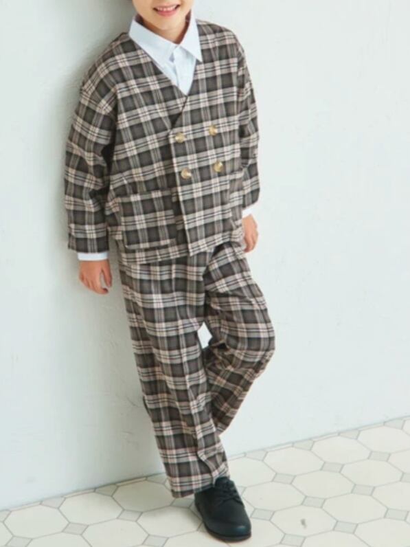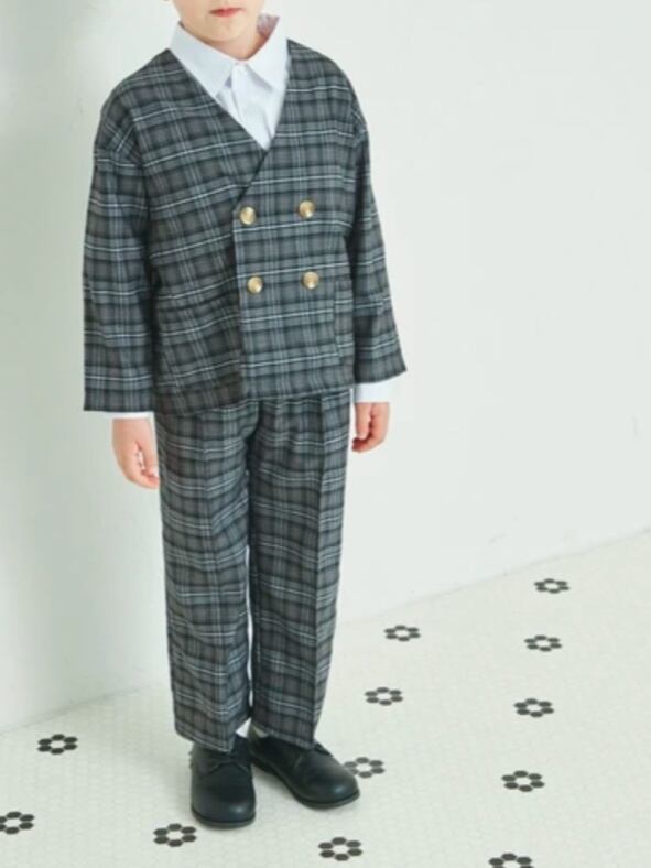 スッキリとした印象のノーカラージャケットはこだわりのダブルボタンデザイン。パンツはゆったりとしたリラックス感のあるシルエットで大人っぽく仕上げました。